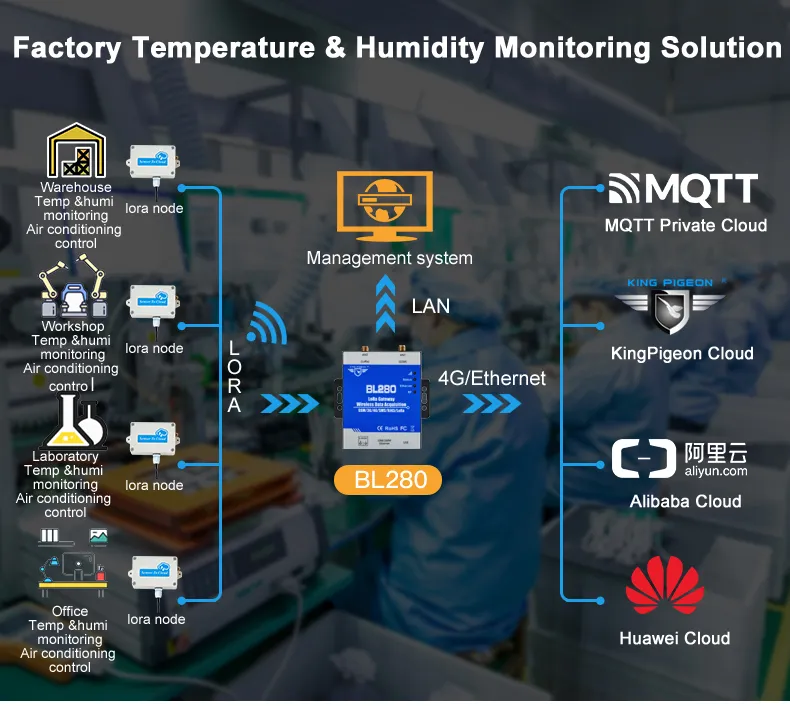 Through the BL280 Lora Gateway, and WT103 LoRa Tempeature sensor, using the LoRa Node WT100 connect to Air Conditioner controller, can automatically monitoring and control the Air-Conditioners.